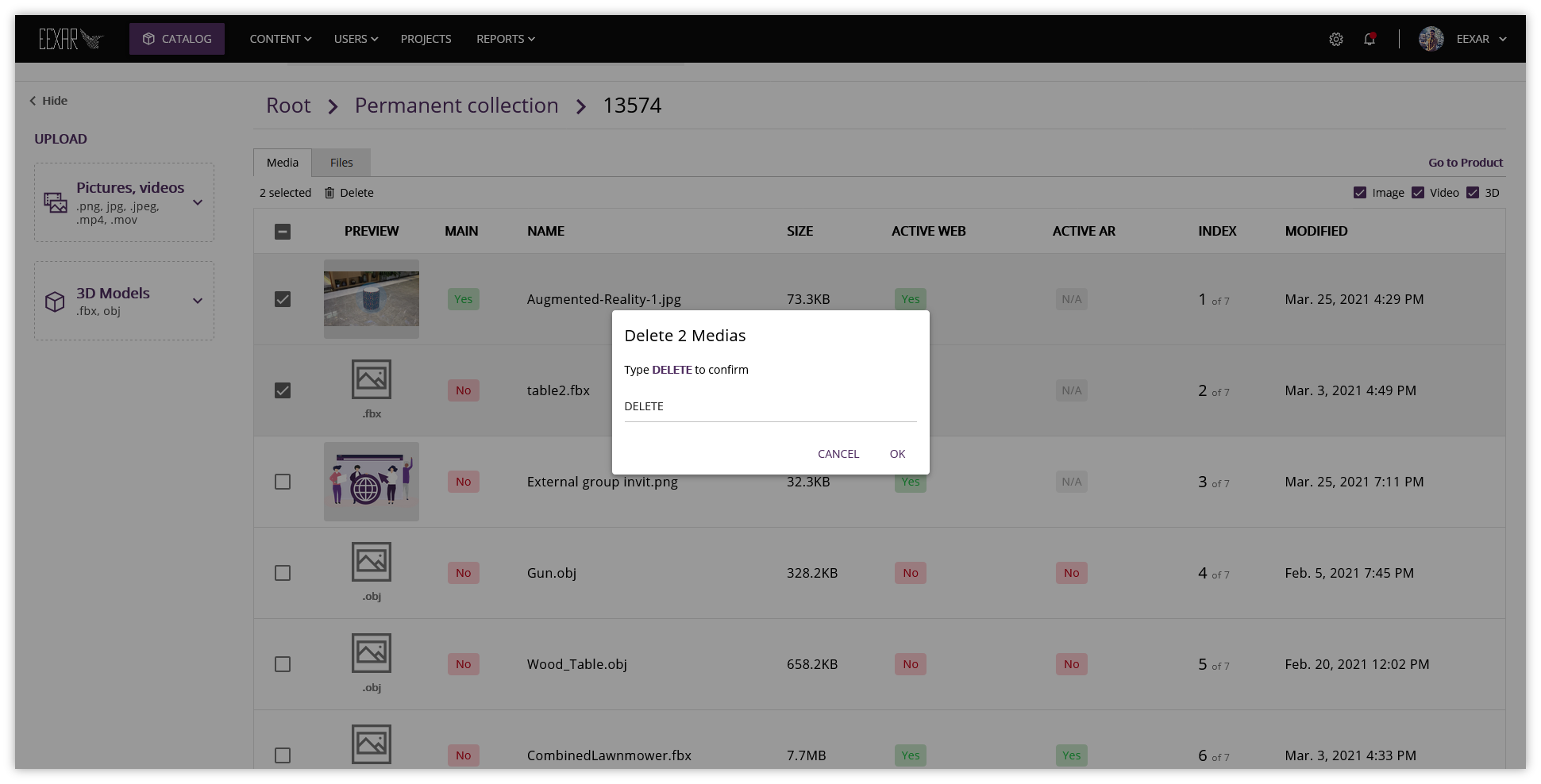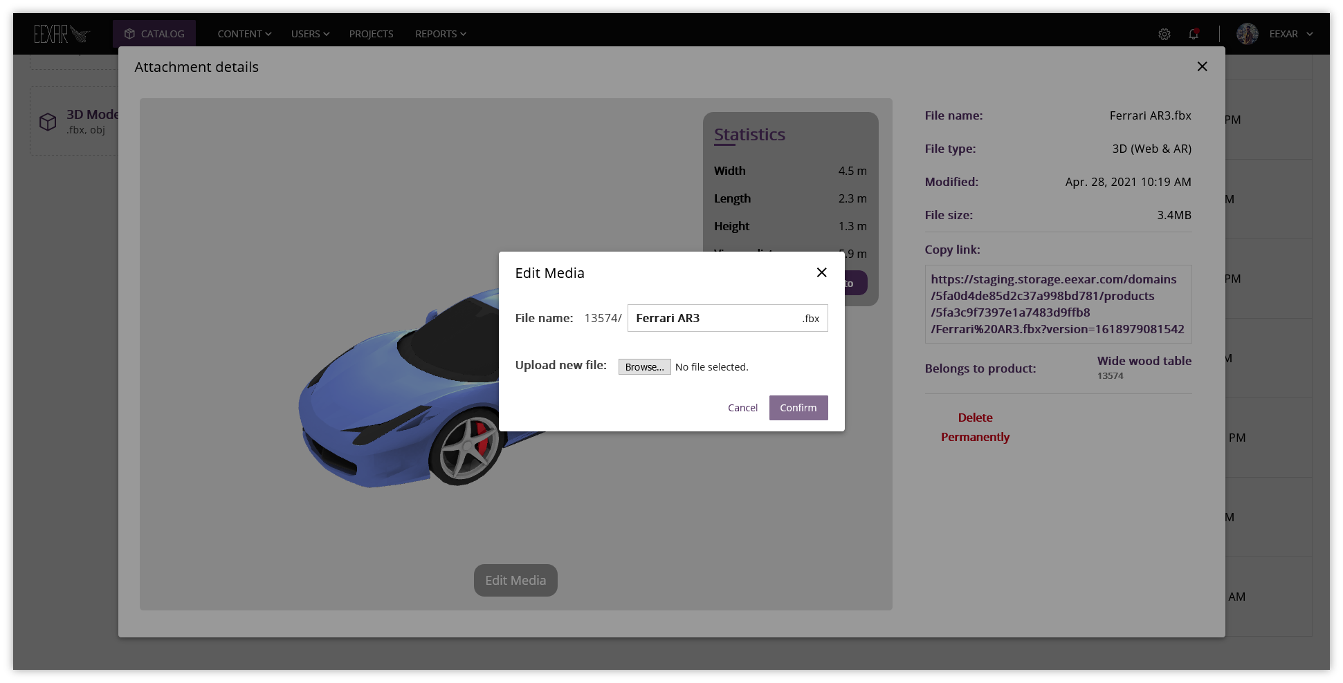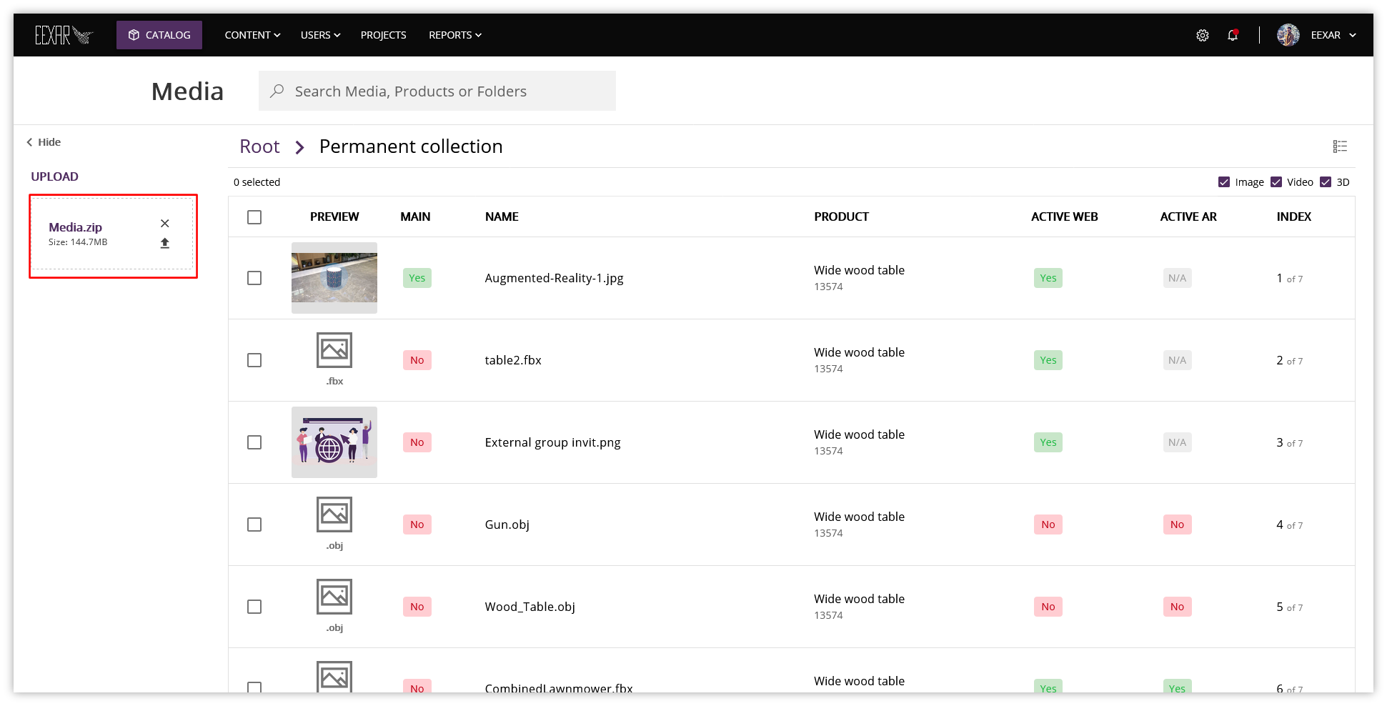 In EEXAR, enriched content can be associated to products, this content is called Media and can be of many different types, the following list recaps the types supported: Pictures Videos 3D Models Binary files (ex: PDF, PPT, Excel, Word etc.) Media ...