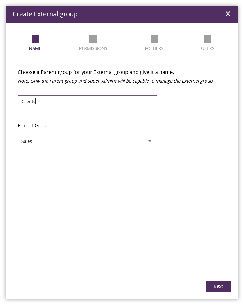 After creating External groups, you can update the group name, permissions and group members as your requirements grow.